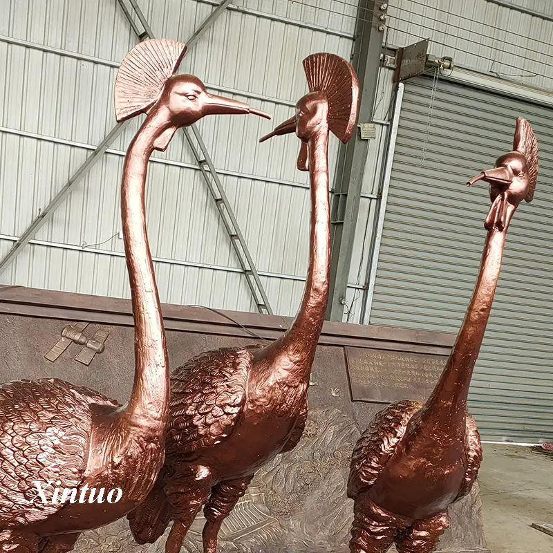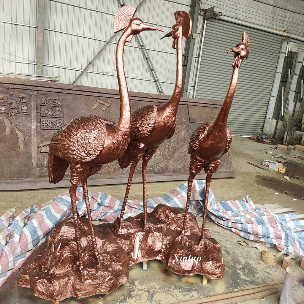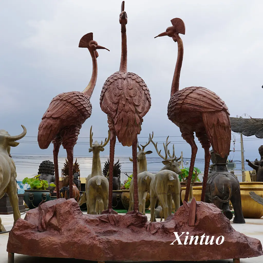 The design inspiration for this bronze crane sculpture comes from cranes in nature. Three cranes stand on rocks in different postures, as if telling a story about nature and harmony. This design creates a dynamic atmosphere throughout the entire piece, allowing people to feel the vitality of life even when stationary.