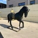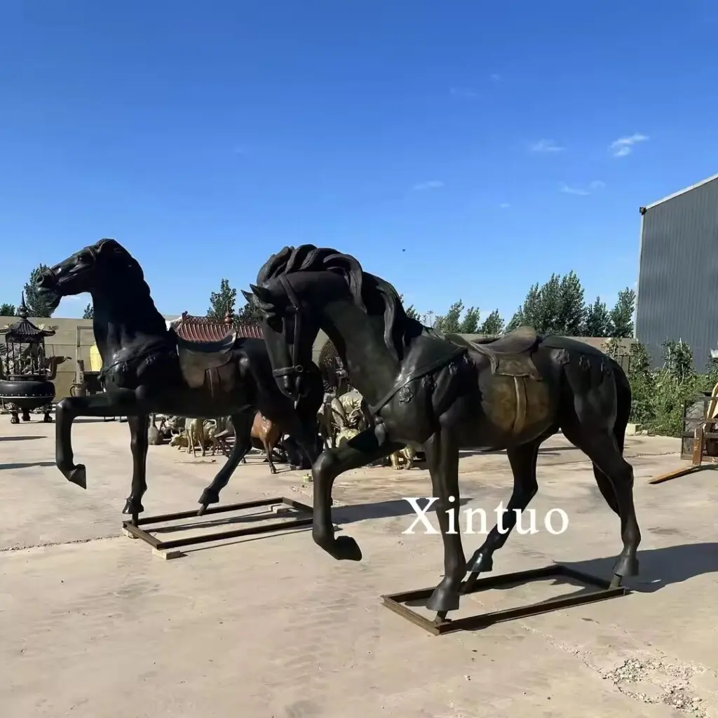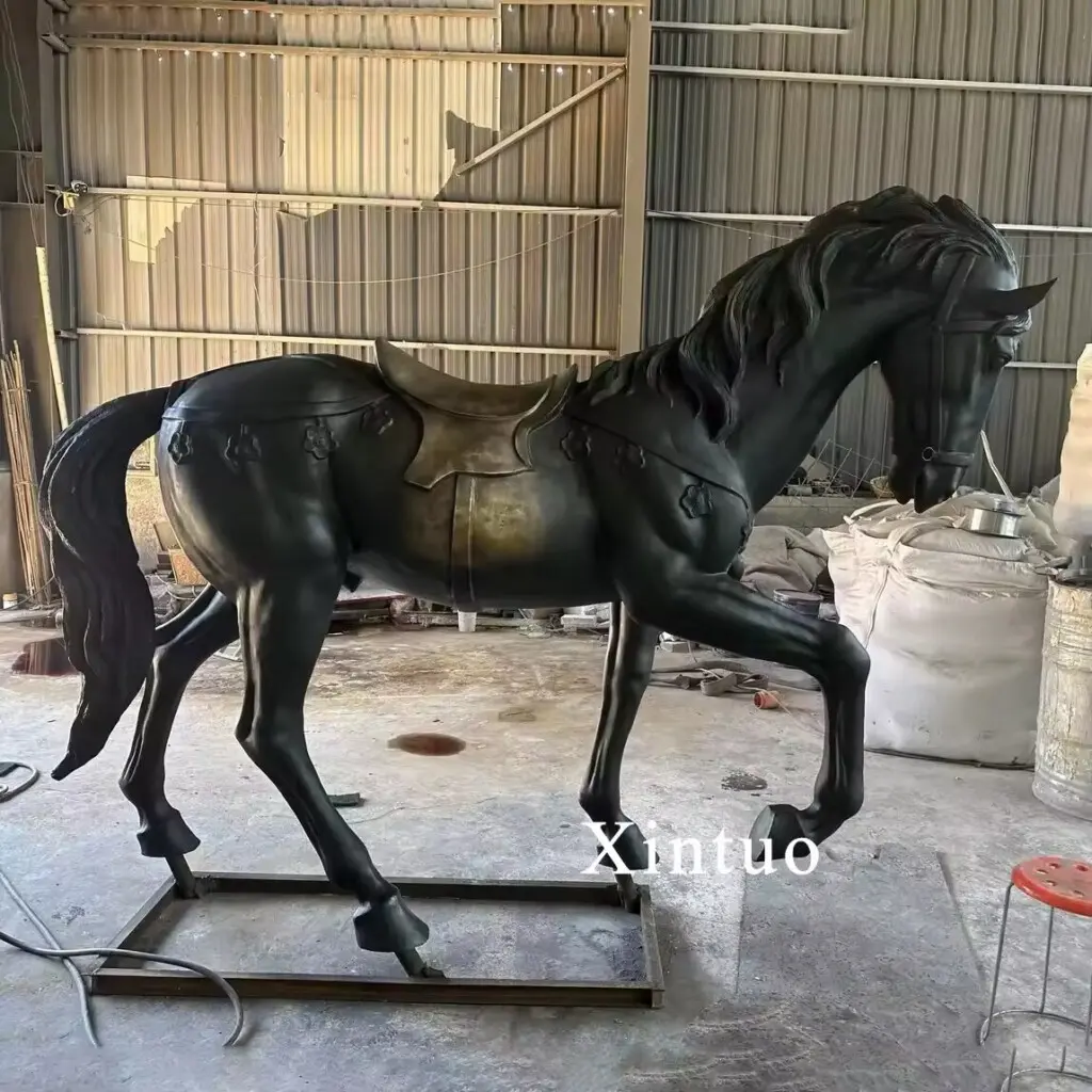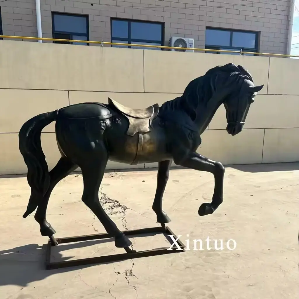 This is a life size outdoor horse statue.The warhorses displayed in large outdoor warhorse statues are full of strength and bravery. The horse lowered its head and lifted one leg, demonstrating its bravery and fighting spirit. The black hair makes the horse look elegant and noble, and the saddle on the back has a copper luster, adding a touch of dynamism and vitality.